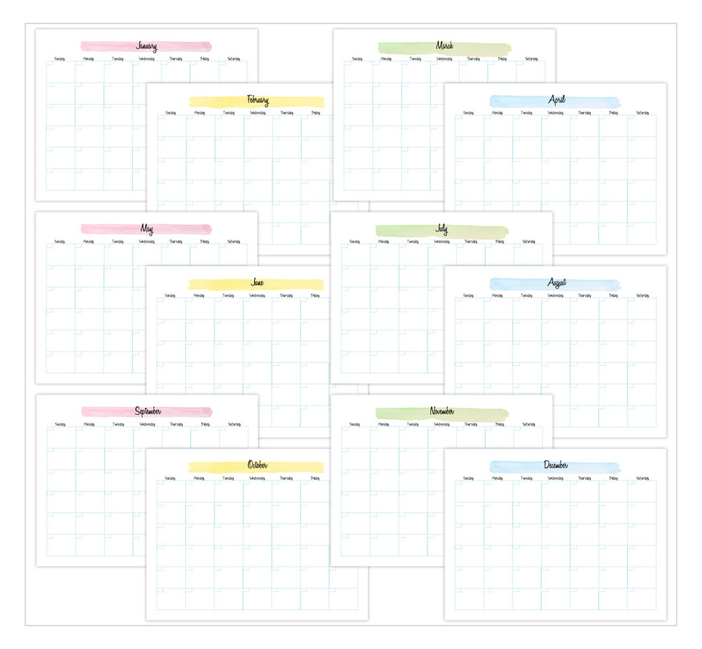 Each of the pages features pastel pink, blue, yellow, or green watercolor designs. Each calendar page includes the month at the top of the page and 6 weeks of blank boxes to write in the dates.