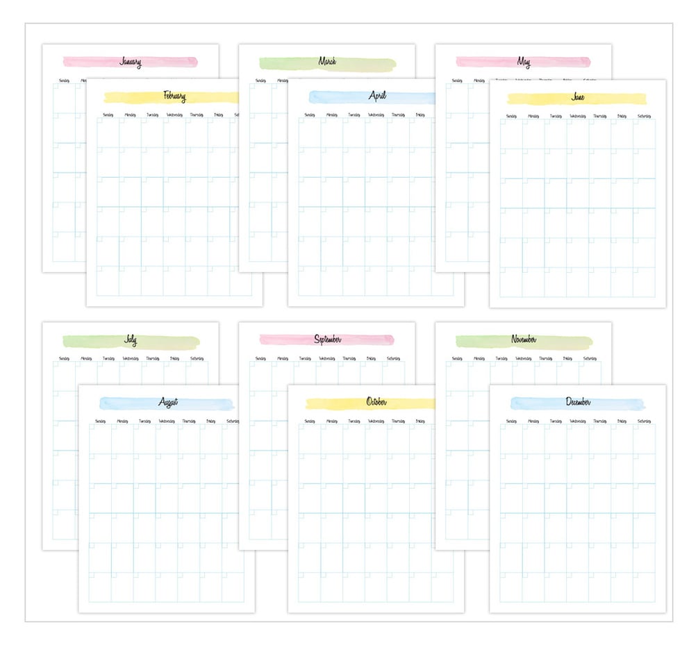 Each of the pages features pastel pink, blue, yellow, or green watercolor designs. Each calendar page includes the month at the top of the page and 6 weeks of blank boxes to write in the dates.